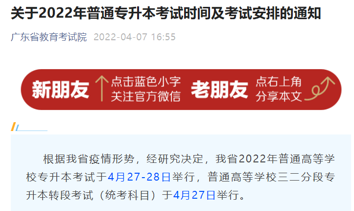 考场信息公布时间 登陆进去之后,点击“考务信息”->“考点查询”,即可看到你被安排到哪个考场了。根据上面的时间: 2021年在考试前两周多公布考场信息(4月10-11日考试) 从表格中可以看出,在2021年考试改革前,官方一般会在考前1个月左右发布全省考场分布。但在改革后,考场只在开通打印准考证的时间公布——通常在考前一周或半个月。 因此小编预测:预计今年2022年的考场在4月13号左右发布! 2. 准考证打印时间 一般在考前7-10天,各位同学可到报考网上打印自己的准考证。 3.考试时间(2022年考试日期改为4月27、28) 4. 上传体检表时间 体检时间:2022年1月1日至填报志愿第一天,请在该时间内体检,超出该时间范围体检无效。 在这个时间段体检完后就马上把体检表上传到报名系统。 5.查询成绩时间 考后一个月就会开放查询系统,大概在四月份考生可查询专插本成绩。公布最低录取分数线。 6.填报志愿时间 大概2022年5月中下旬填志愿,只有超过了最低录取分数线,才有填报志愿的资格。 7.查询录取结果时间 2022年6月初查询录取结果;注意:只报考了校招的同学请留意报考院校的录取情况,同样可在报考网查询录取情况。 8.补录时间 补录也叫征集志愿,预计在2022年6月中下旬补录 2021年的插本补录时间很短只有一天,非常匆忙,今年录取时间段暂时未公布,请以考试院为准。 在第一阶段未被录取或漏报志愿的考生,可参加补录,补录按照第一批-第二批-第三批的投档顺序进行投档,上一个批次结束后才进行下一批次的投档录取。 9.邮寄录取通知书时间 在7月-8月,被录取的学生会陆续收到录取通知书,然后在9月份去学校报到就读。